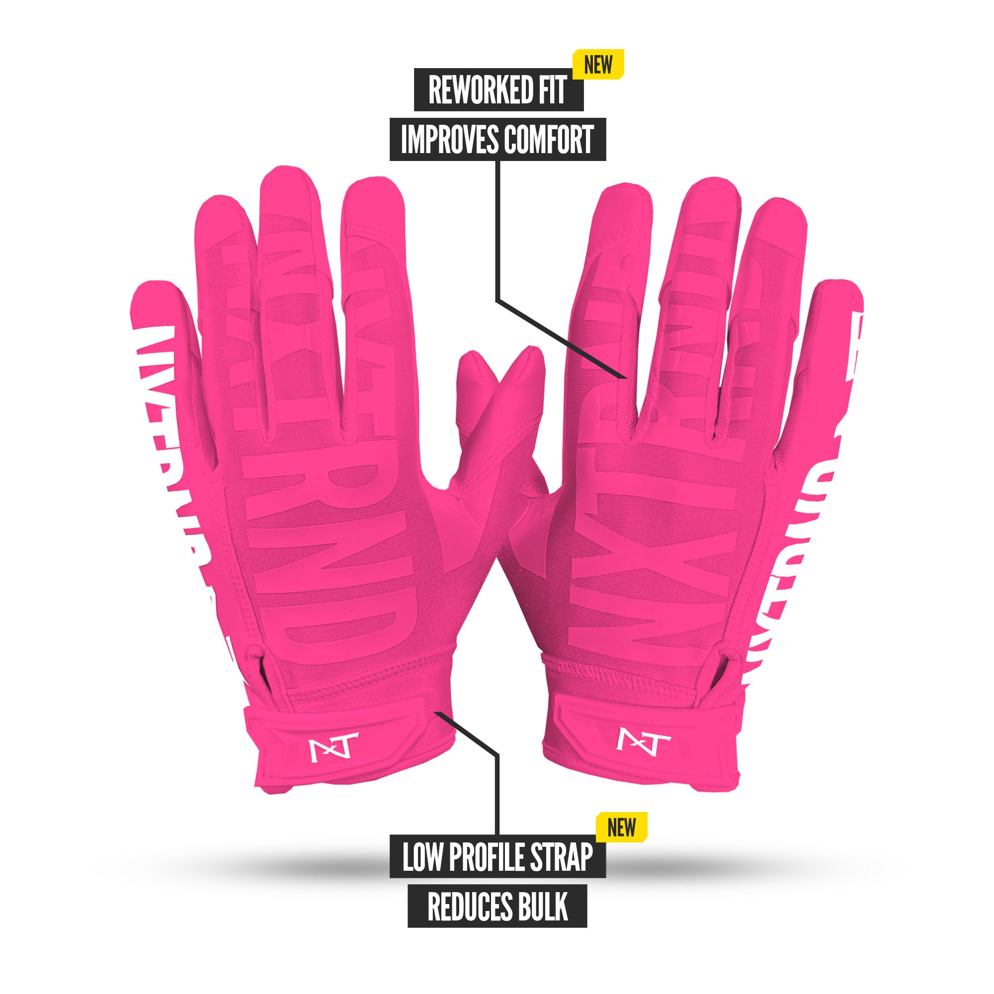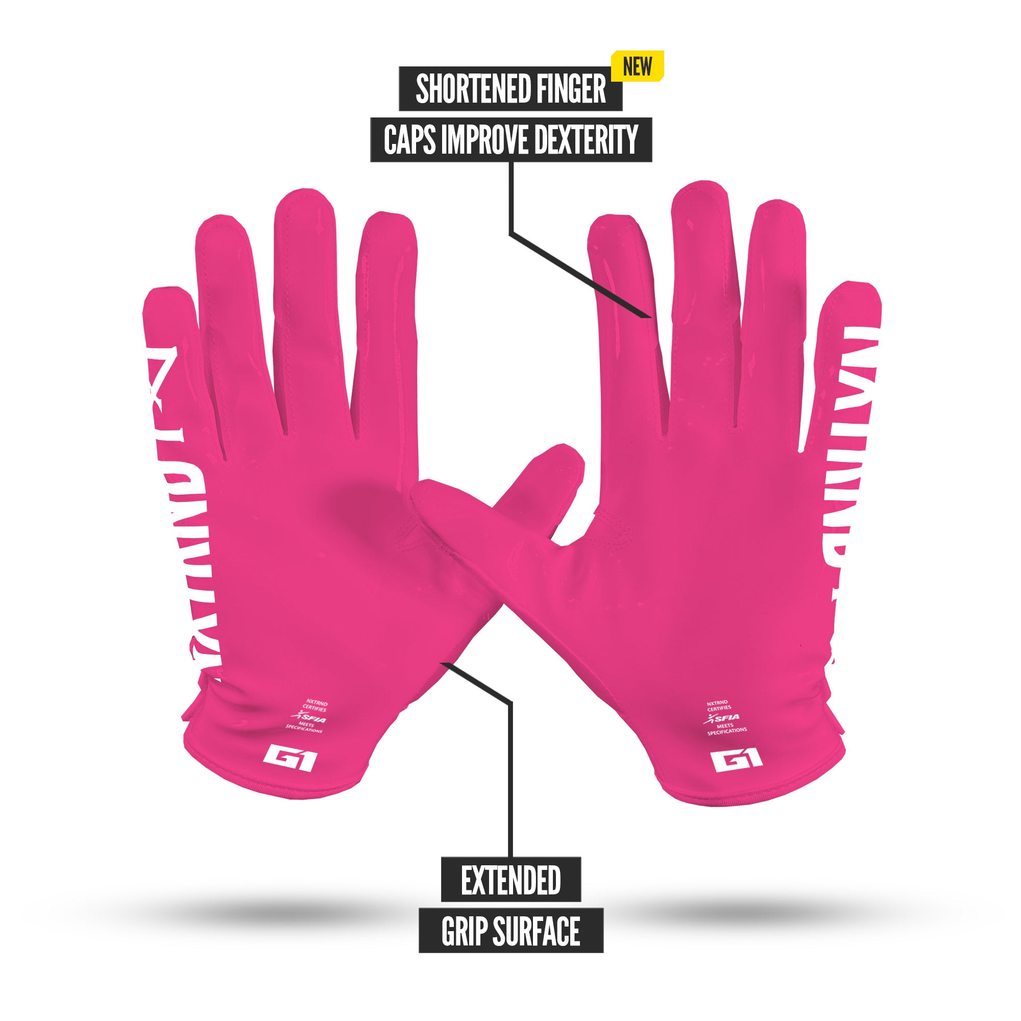 Play like the pros with NXTRND G1 Pro® football gloves: reworked fit. shorter finger caps for better ball feel. and updated stitching to reduce bulk.
