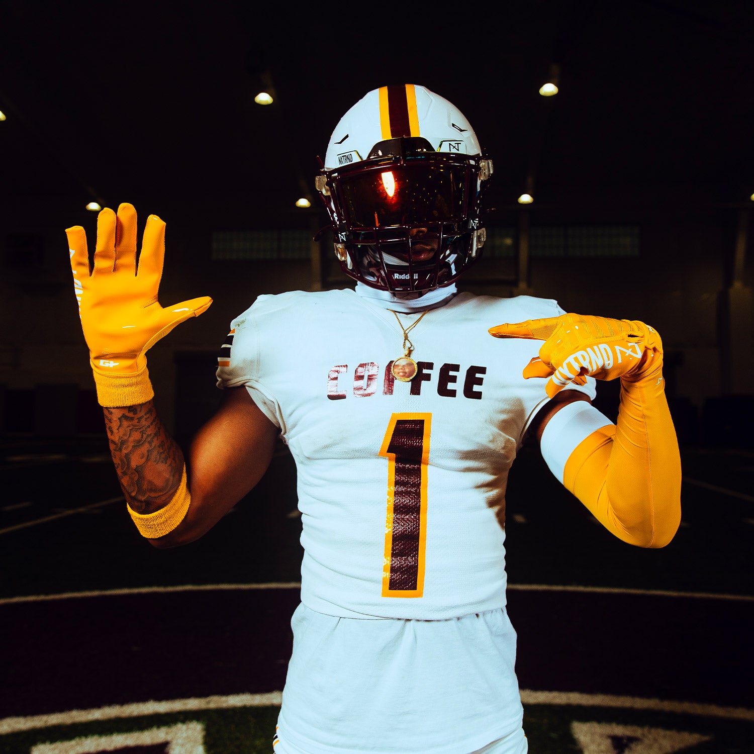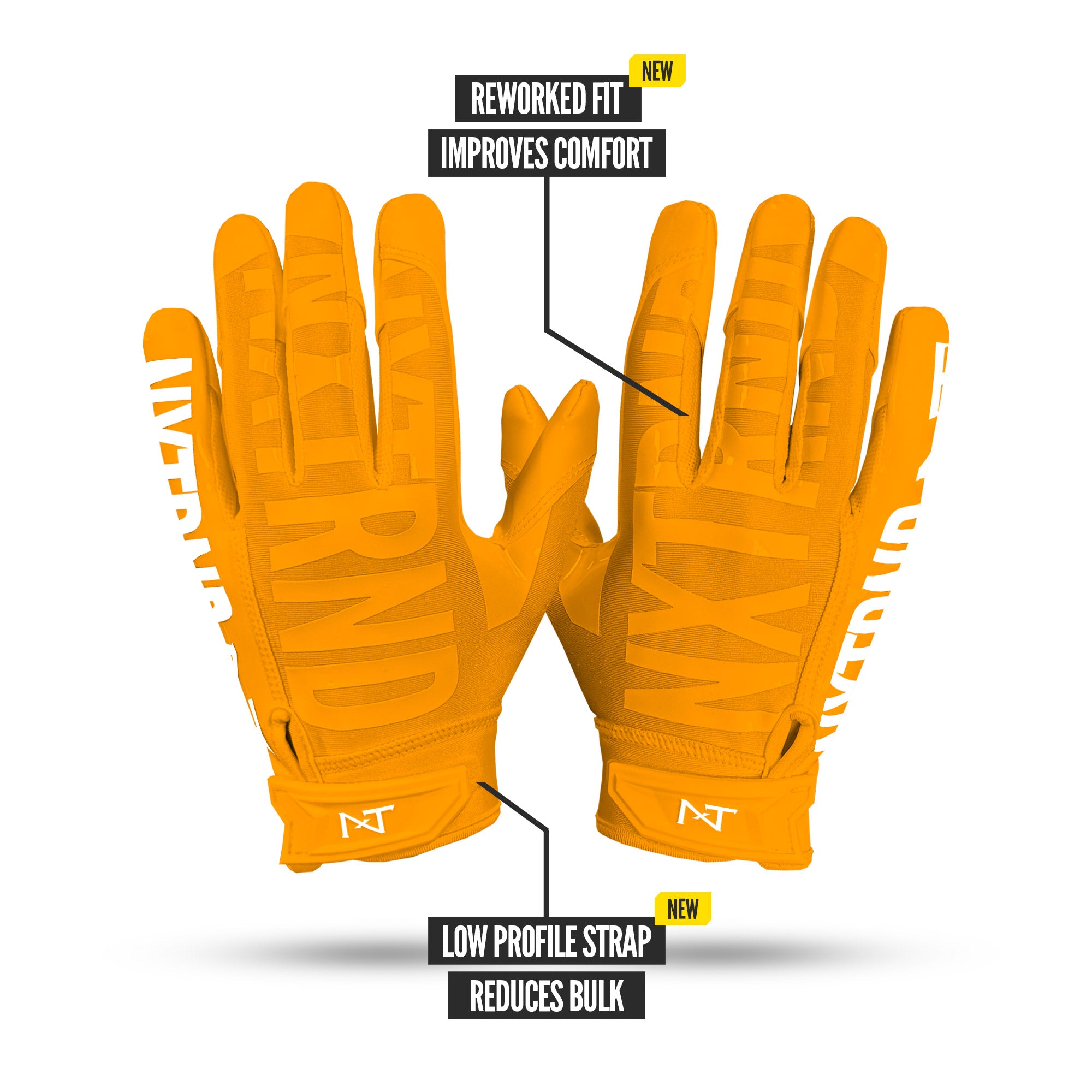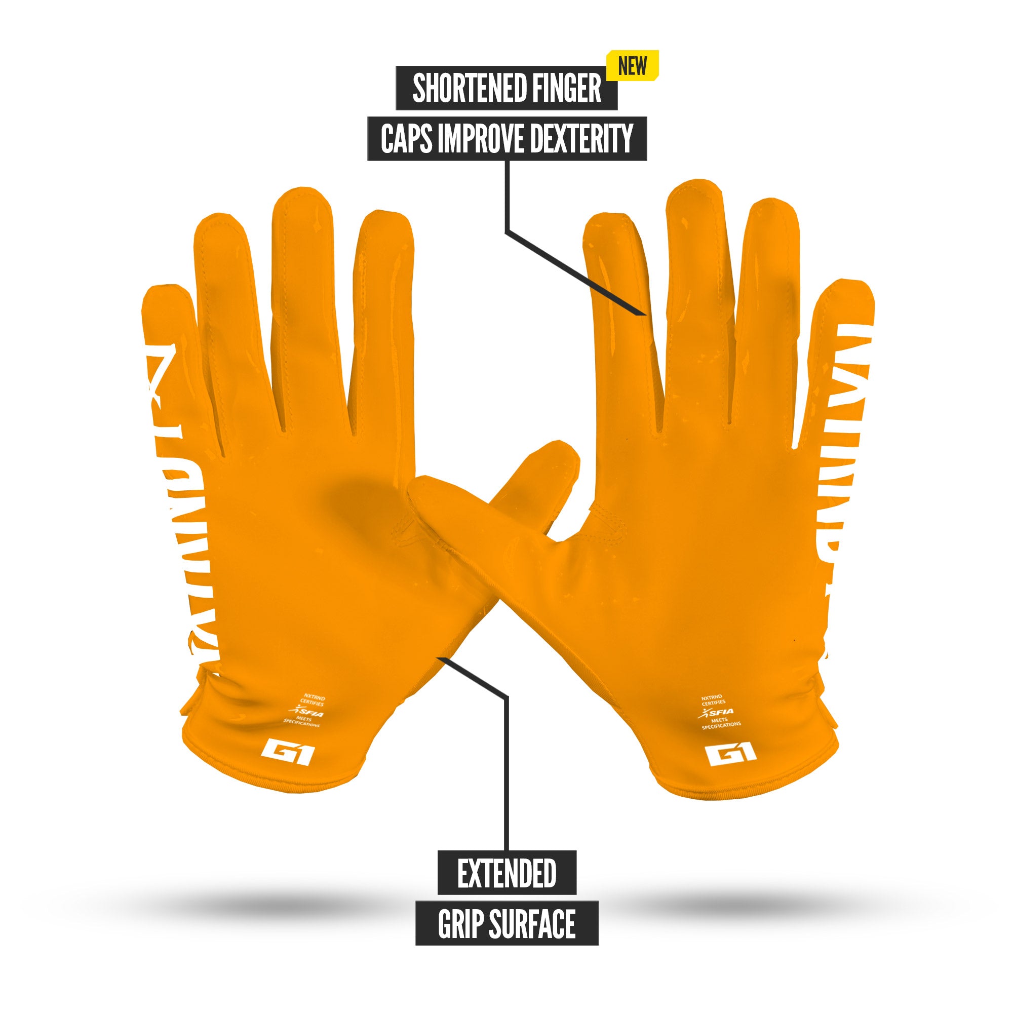 Play like the pros with NXTRND G1 Pro® football gloves: reworked fit. shorter finger caps for better ball feel. and updated stitching to reduce bulk.